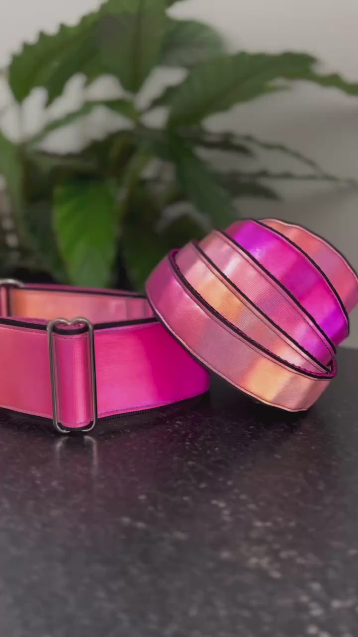 A colorful and reflective dog collar, handmade in Finland. This unique collar is a true eye-catcher both in daylight and in the dark! The surface shines beautifully in natural light and offers a bright, clear reflection at night.